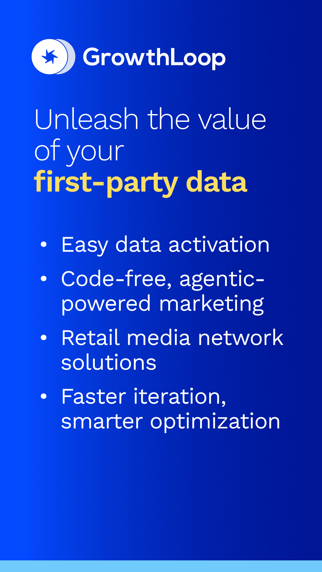 GrowthLoop is a Compound Marketing Engine that drives compound growth by accelerating the marketing cycle, using Agentic AI powered by your enterprise cloud data. Growth Agents propose audiences and journeys, and activate campaigns across channels, streamlining execution and continuously analyzing performance data to make suggestions for campaign optimization.